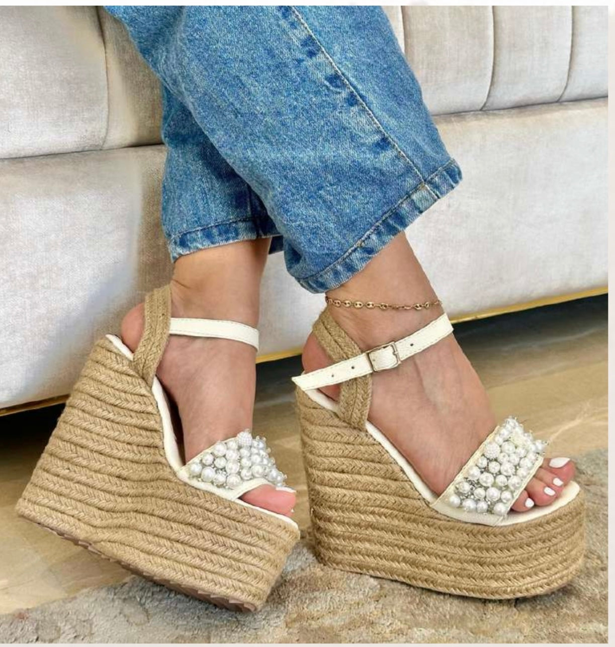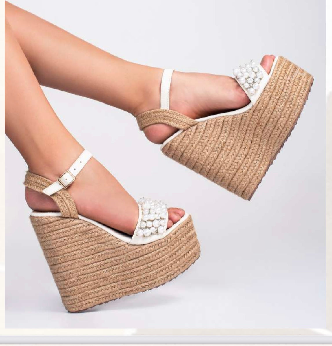 Enamórate de cada paso con estas espectaculares plataformas! Su diseño de yute trenzado, las delicadas perlas que adornan las tiras blancas y el toque dorado de la hebilla hacen de este calzado la joya de cualquier outfit veraniego. Perfectas para elevar tu estilo sin sacrificar comodidad. ☀️ #PlataformasDeEnsueño